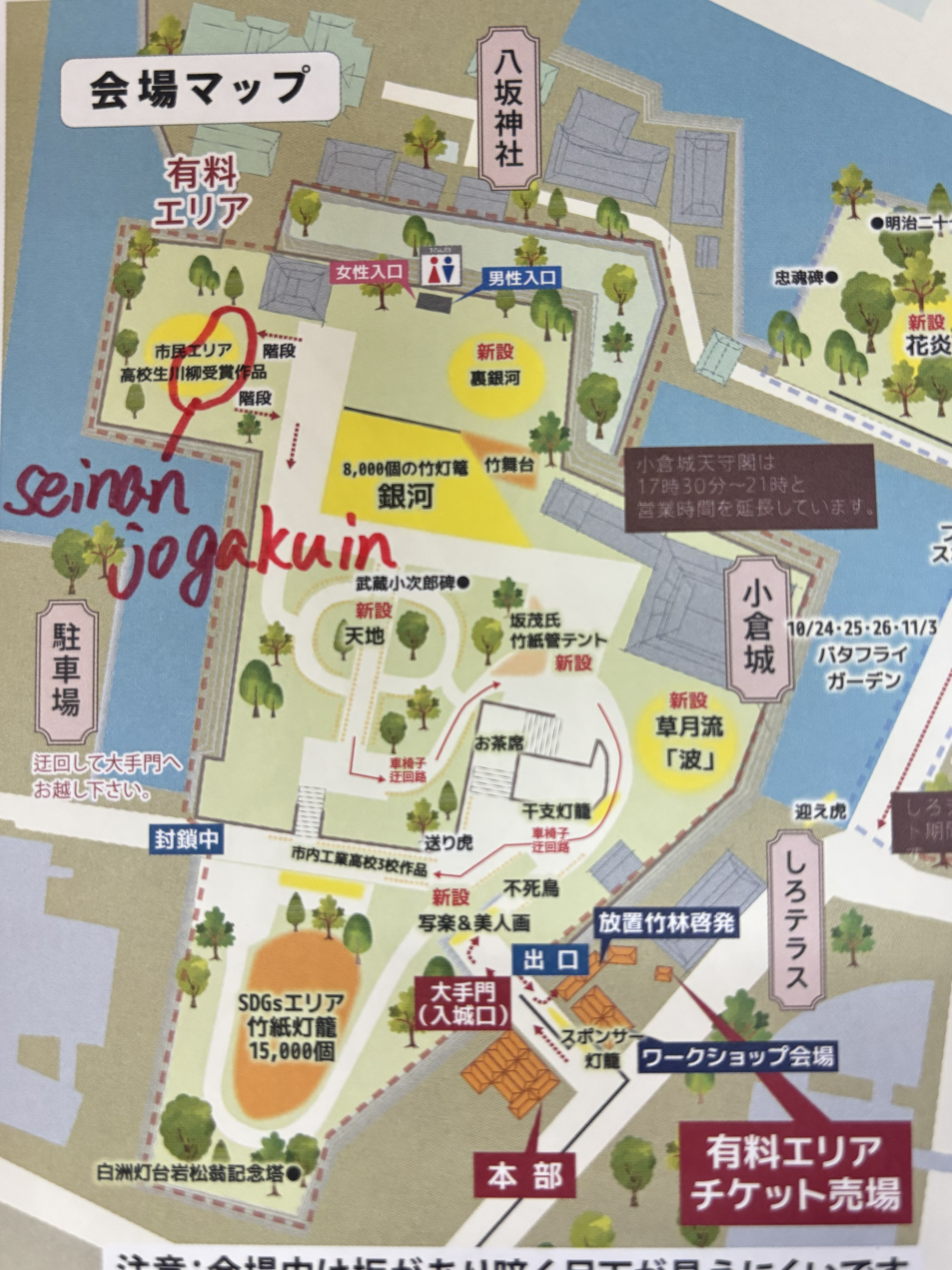 有料エリアになりますが、10月24日(金)~11月3日(月)までやっていますので、是非ご覧ください。 なお、西南女学院のエリアは、一番奥のエリア(マップ表示)になります!!お見逃しなく!!