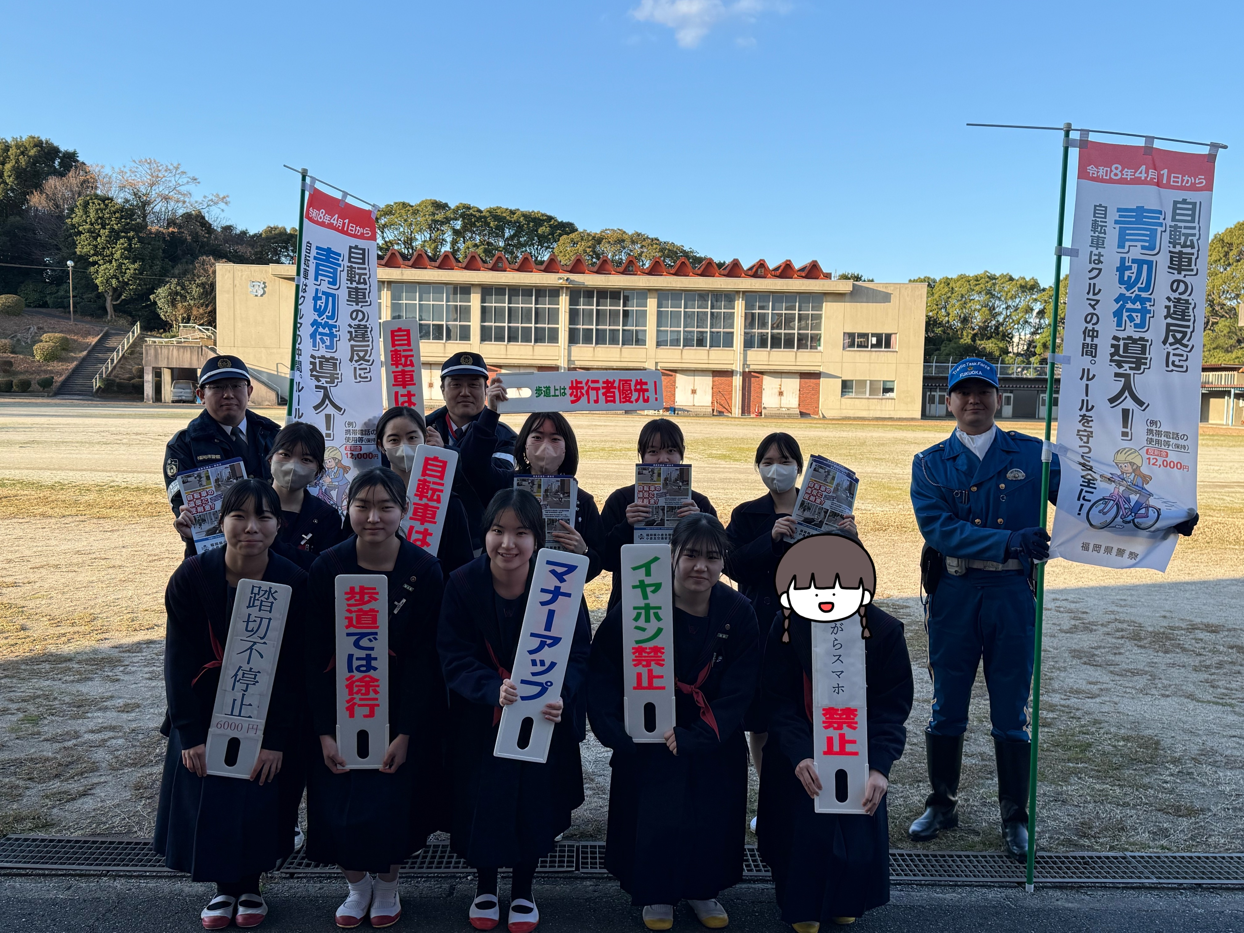 本日、北警察署の職員の方と生徒会メンバーで、朝昇降口に立ち自転車違反反則金についての案内チラシを配ったり、 プレートを持ってアピールしたりしました。 4月1日より、自転車の販促に反則金(青切符)の取り締まりが適応されるようになります。これは16歳以上が対象になります。